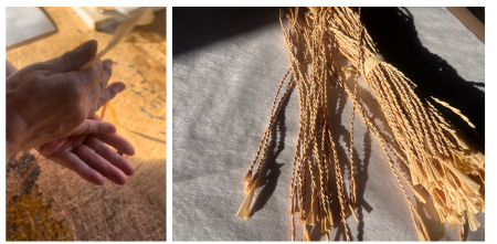 まな板は節の部分を除き、一枚一枚手作業でリンゴの形に切り取って、仕上げております。また上部の紐も、薄く削ったひばカンナを手で編んでいます。